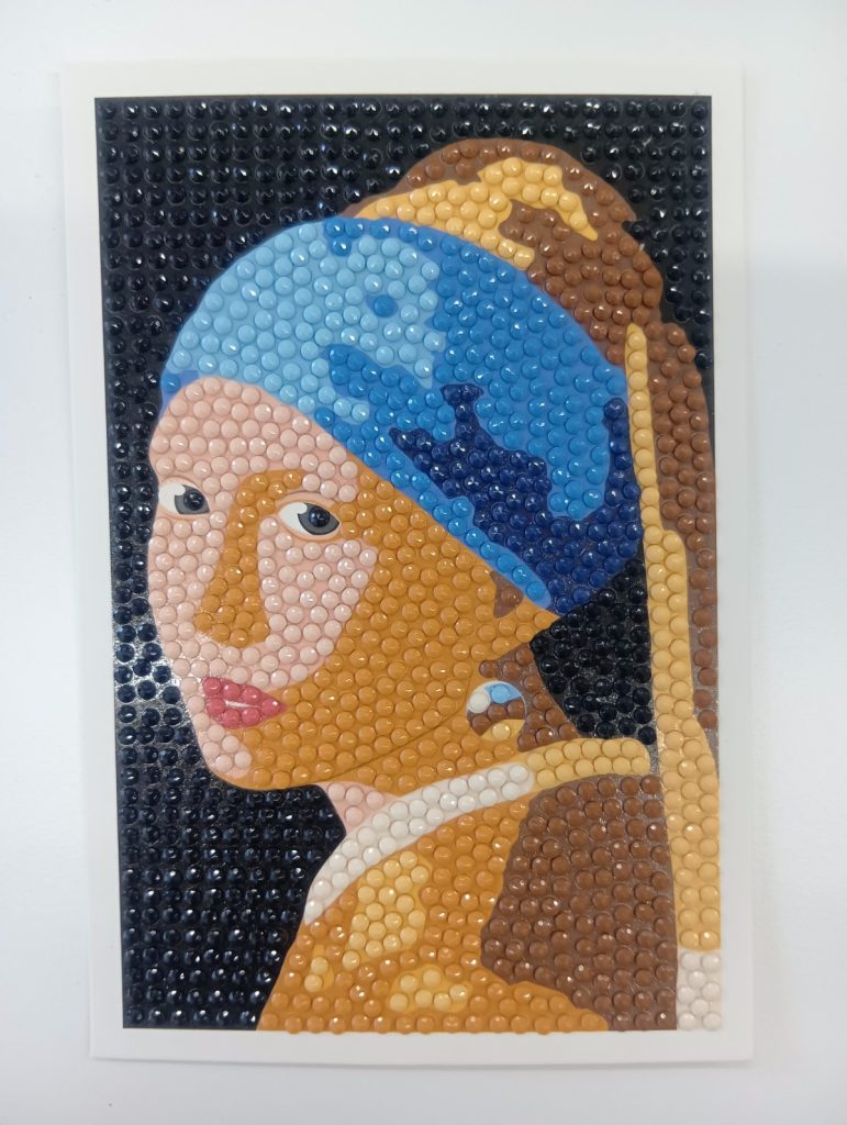 作業の一部をご紹介✨ 2025/10/09 本日は、ビーズアートで作成した真珠の耳飾りの少女をご紹介✨️ 目、鼻、口、青いターバンなどに適した色のビーズを、的確にくっつけていきます🤗 青いターバンの少女が立体的に完成しています✨️ 利用者の皆さん、とても上手で、職員一同感動です😆