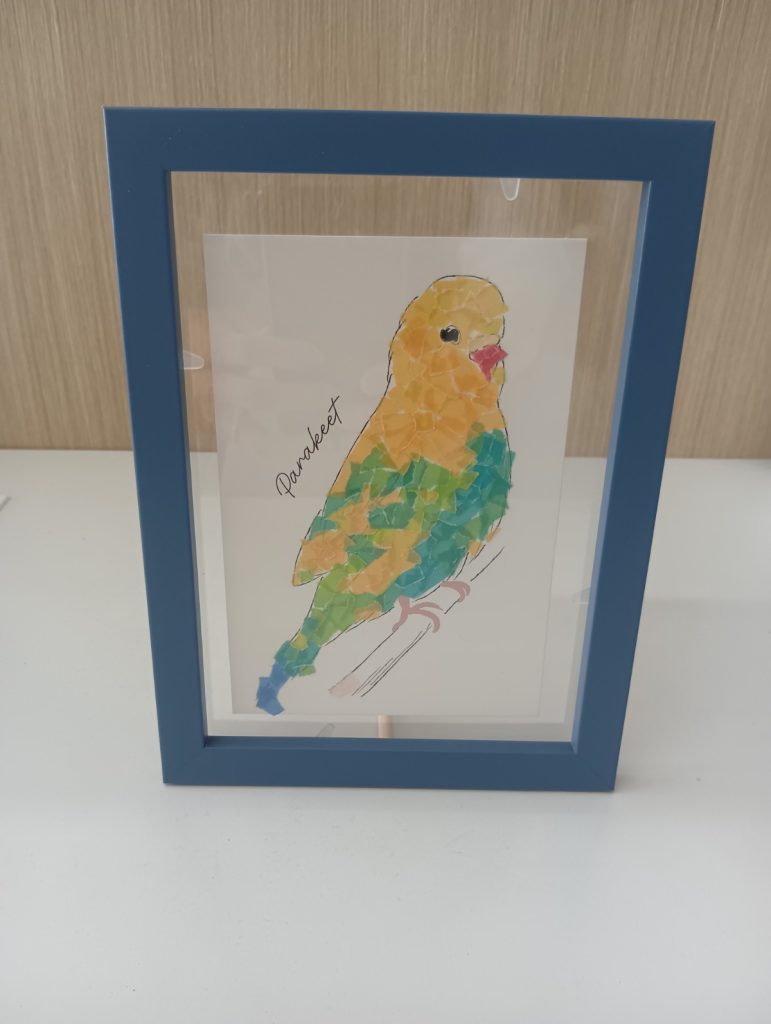 ちぎり絵のご紹介✨️ 2025/10/17 本日は小鳥のシールちぎり絵をご紹介✨️ 小鳥のマークが描かれている線の枠に、適切な色を切って貼り付けていきます😄 黄色と緑の可愛い小鳥が立体的に完成しています✨️ 部屋などに飾れば、インテリアアイテムとして、オシャレですね😆 利用者の皆さん、とても上手で職員一同感動です✨️
