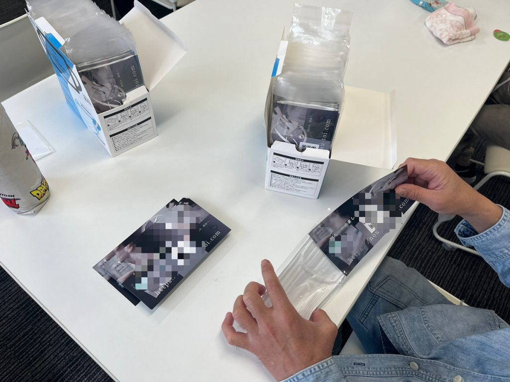透明袋にマスクを入れて⇨チラシを入れて⇨封を閉じます。